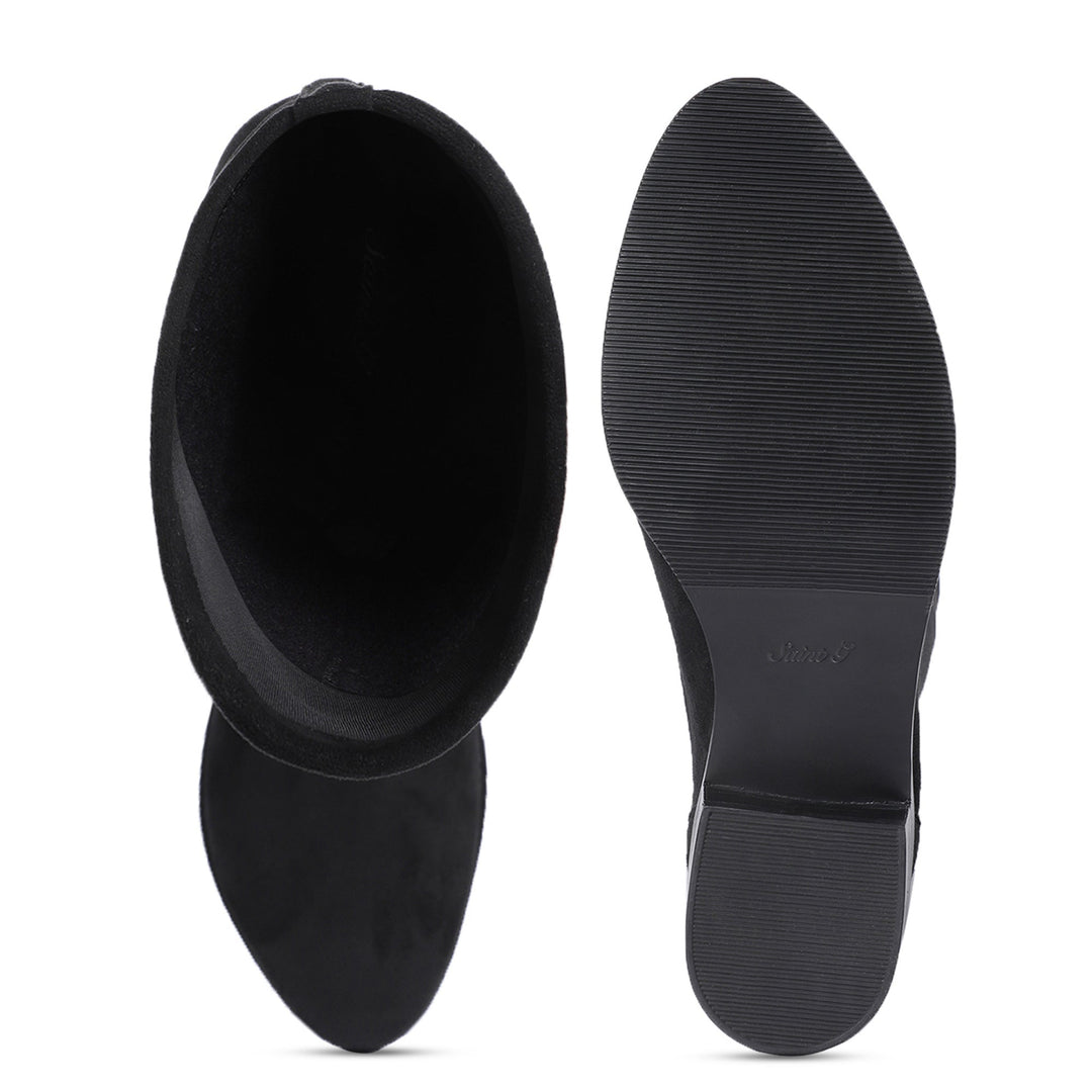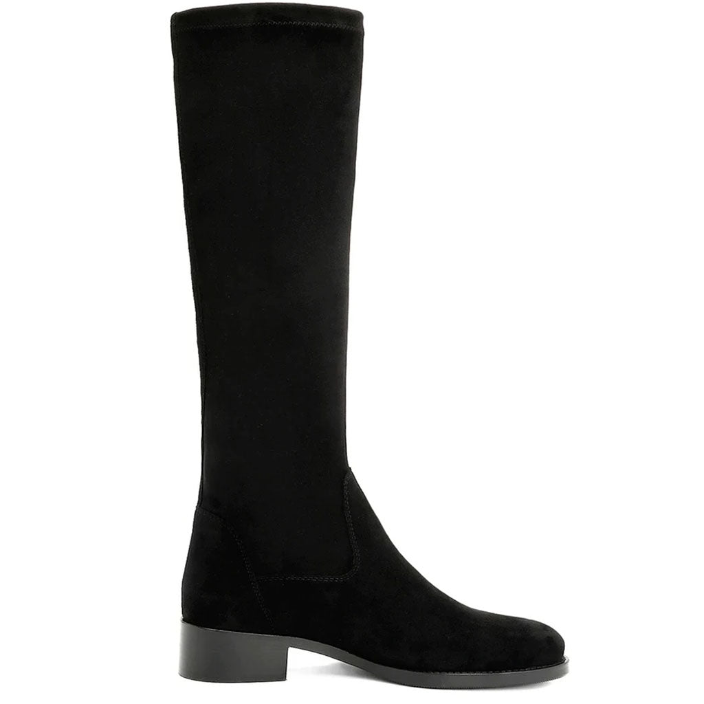 Black Stretched Suede with leather lining rounded toe knee high Boot. The approx. height of the boot is 18.7 Inches.